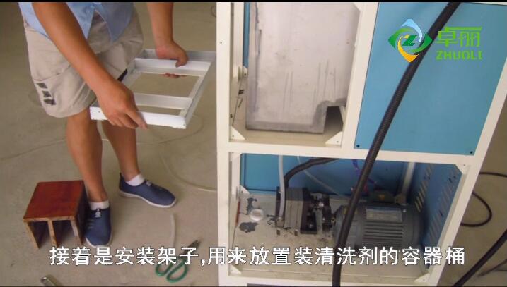 4、接著(zhù)是安裝架子,用來(lái)放置裝清洗劑的容器桶,用螺絲加以固定