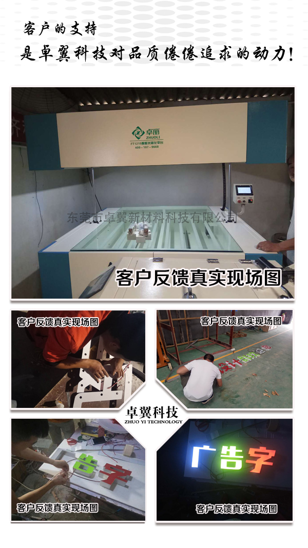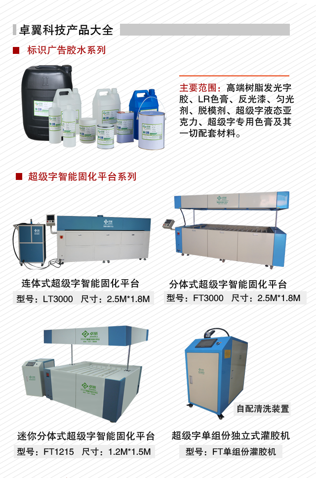 卓麗超級字固化平臺,是卓翼科技機器設備事業(yè)部為了制作高效批量的超級字,而自主研發(fā)生產(chǎn)的高端智能計量灌膠固化一體化平臺。卓麗超級字固化平臺一經(jīng)上市,以其優(yōu)越的性能和特點(diǎn),贏(yíng)得了一大批中大型廣告標識工廠(chǎng)的關(guān)注和歡迎,成為了采購的熱門(mén)廠(chǎng)家。