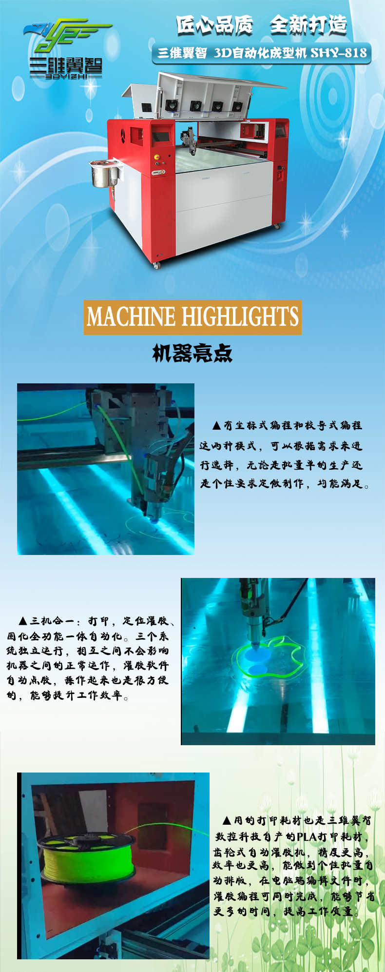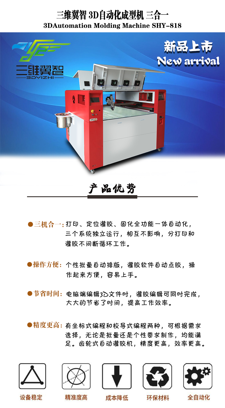 三維翼智數控科技推出最新型的3D打印機器,全新打造的三合一機器。所謂的三合一就是三機合一,打印、定位灌膠、固化全功能一體自動(dòng)化。三個(gè)系統獨立運行,相互不影響,分打印和灌膠不間斷循環(huán)工作,機器外觀(guān)尺寸1.73M(L)*1.65(W)*1.45(H),能節省很多的空間位置,也能提高工作效率。