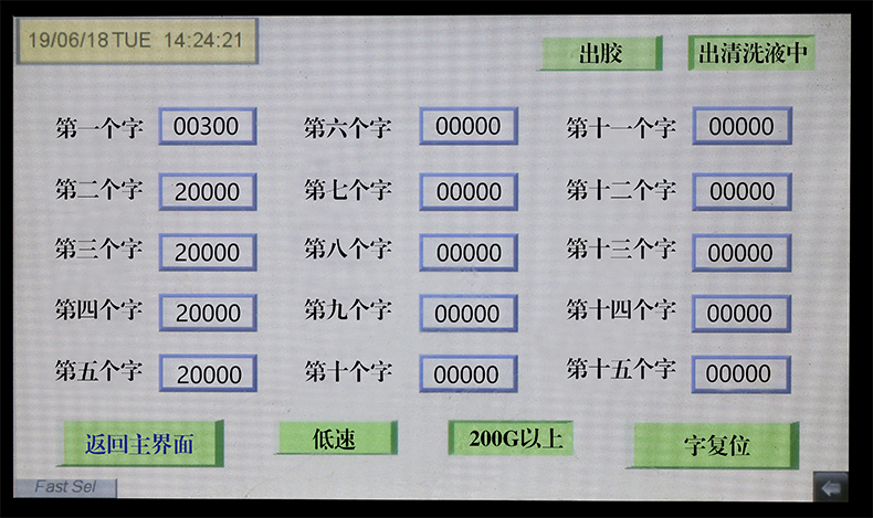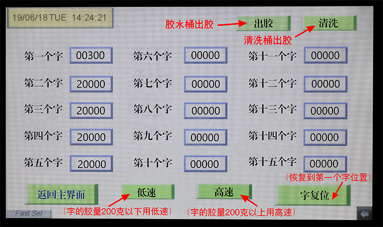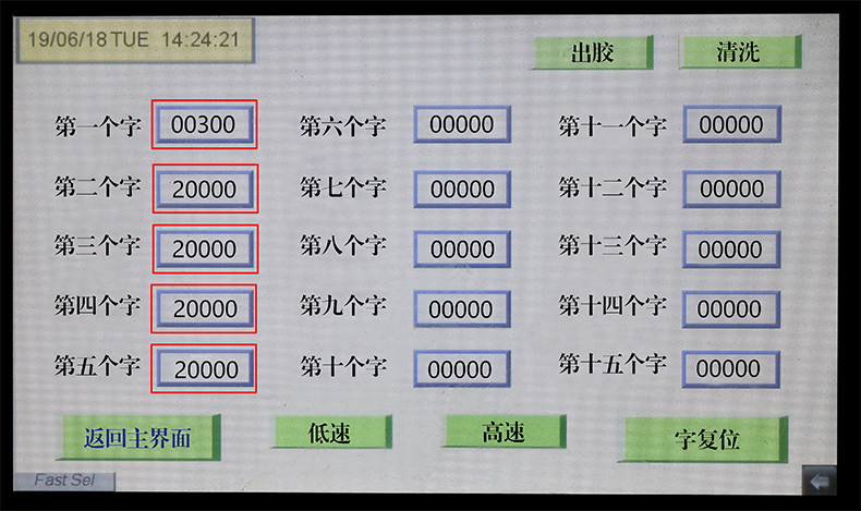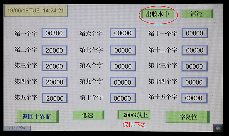 從清洗桶打出清洗液到膠水桶中,操作方法:同時(shí)按下【高速】和【清洗】 。