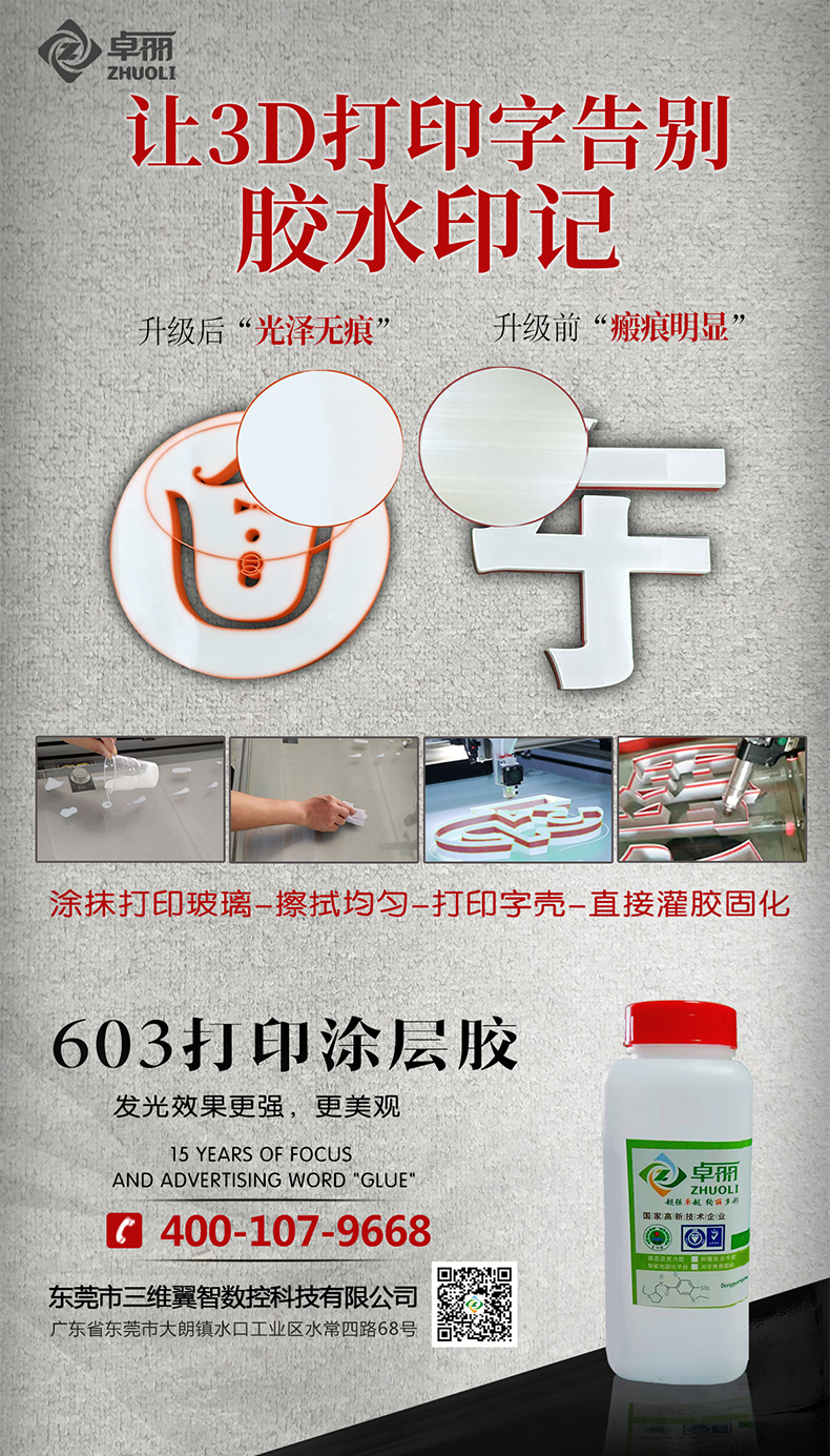 隨著(zhù)發(fā)光字3d打印越來(lái)越受歡迎,逐漸成為了廣告行業(yè)的一個(gè)熱門(mén)的項目。那么為了能夠更好的做出美觀(guān)的發(fā)光字,卓翼科技獨家研發(fā)出來(lái)一款3d打印專(zhuān)用的升級版涂層膠,可用于打印3d字殼后直接灌單組份亞克力膠并進(jìn)行UV光固化,脫模后表面效果光滑無(wú)痕跡。